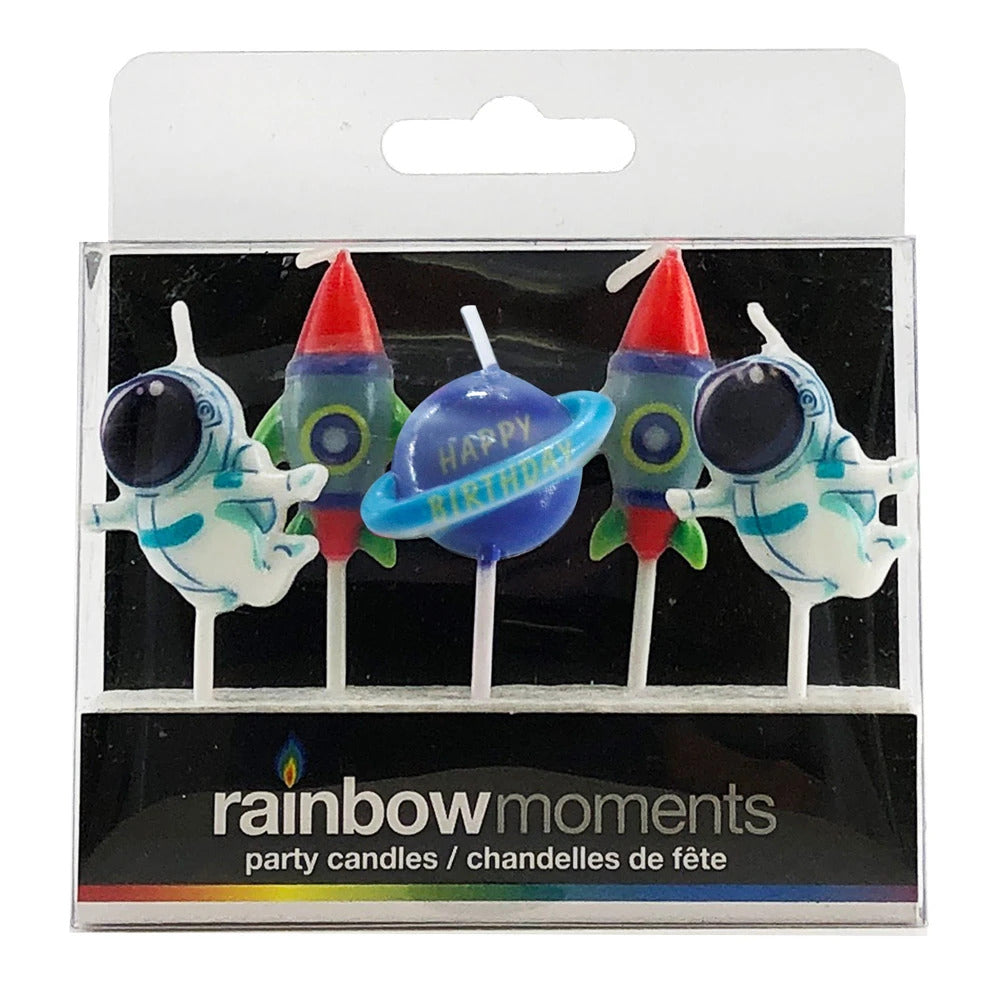 These space-themed party candles (traditional flame) are great for cakes and cupcakes. contains 5 candles: 2 spacemen, 2 rockets, 1 Happy Birthday plane