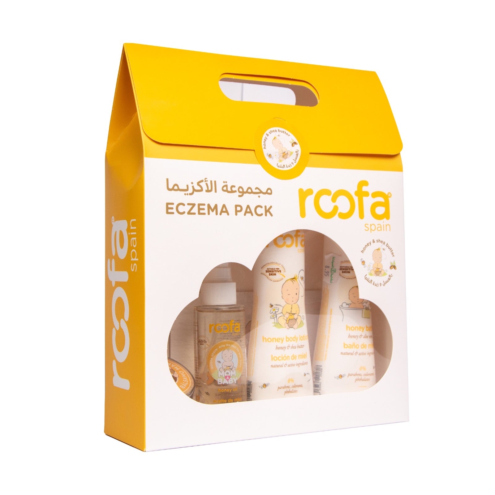Roofa Honey and Shea butter Line is very effective in treating baby’s eczema and skin’s dryness , as it contains Honey which has anti-inflammatory effect and Shea butter which hydrates and soften the skin. You need to use the whole range as per the following: • Use the honey bath for hair and body cleansing with warm water • Post bath, Use the honey massage oil on wet skin. • During the day , it’s recommended to moisturize the body several times using the Honey Body Lotion. • Use the honey Mom and Baby Balm on the dry, red, and irritated patches.