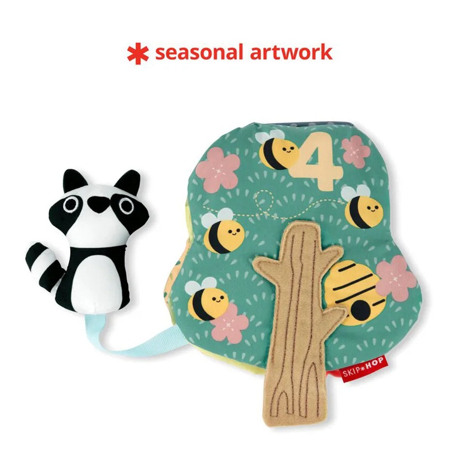 Winter, spring, summer, fall—our soft activity book introduces baby to the changing seasons with adorable nature-inspired artwork, cute animals, numbers for counting and more. Designed to encourage sensory exploration, each page features crinkle sounds, multiple textures, peekaboo play details, a baby mirror and a teether toy. For extra hide & seek fun, the soft raccoon toy can be popped in & out of the hole in each page.