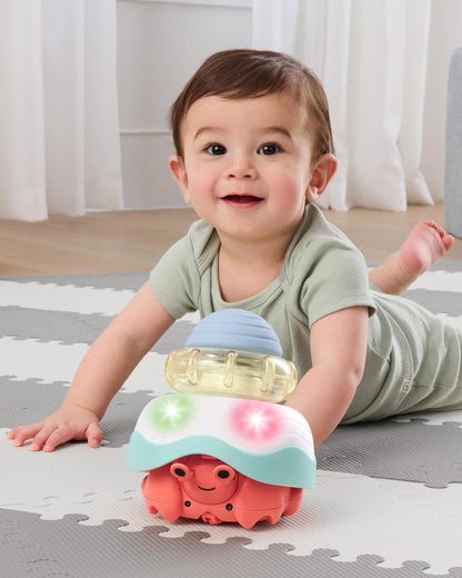 Encourage learning to crawl adventures and sensory exploration with our cute crawling crab baby toy! Featuring four grow-with-baby stages, our action-packed baby crawl toy engages little ones with lights, fun sound effects, cheerful music and lots of movement to help get baby crawling. Start baby off with rattle & teething play, then move onto sorting & stacking as your little one learns, grows and develops. Beginning crawlers will love to follow along as the interactive crab peeks out from under its shell and moves in a circular pattern, while advanced crawlers are encouraged to chase the crab as it moves in more random patterns.