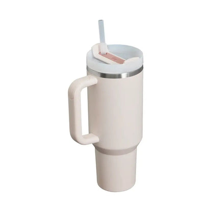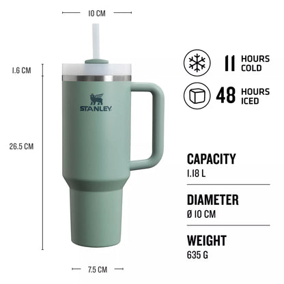 • Constructed of 90% recycled stainless steel for sustainable sipping, the Stanley Quencher H2.0​ Flowstate™ Tumbler 40OZ helps you reach your hydration goals with fewer refills. Working, workouts, road trips — you’ll want this Stanley cup always by your side. Thanks to Stanley’s vacuum insulation, your water will stay cold for 11 hours, 2 days when iced. The advanced FlowState™ lid features a rotating cover with three positions: a straw opening designed to resist splashes while holding the reusable straw in place, a drink opening, and a full-cover top. The ergonomic handle includes comfort-grip inserts for easy carrying, and the narrow base fits just about any car cup holder. Lastly, every piece of this stainless steel water bottle is dishwasher safe. Don't miss out on the hydration must-have you never knew you needed. Available in 4 bold, eye-catching colors: Rose Quartz, Chambray, Eucalyptus and Charcoal.