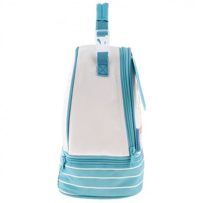 Two spacious compartments. Fully lined and insulated. Extendable strap. Approx. 17cm x 24cm x 14cm. Perfect for school and picnics.