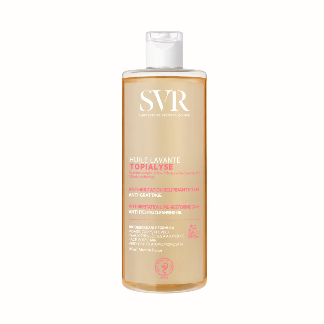 SVR Topialyse Micellar Cleansing Oil 400ml is a lipid-restoring cleansing oil anti-itching ideal for the atopic dry skins of the whole family, to apply on both face and body.