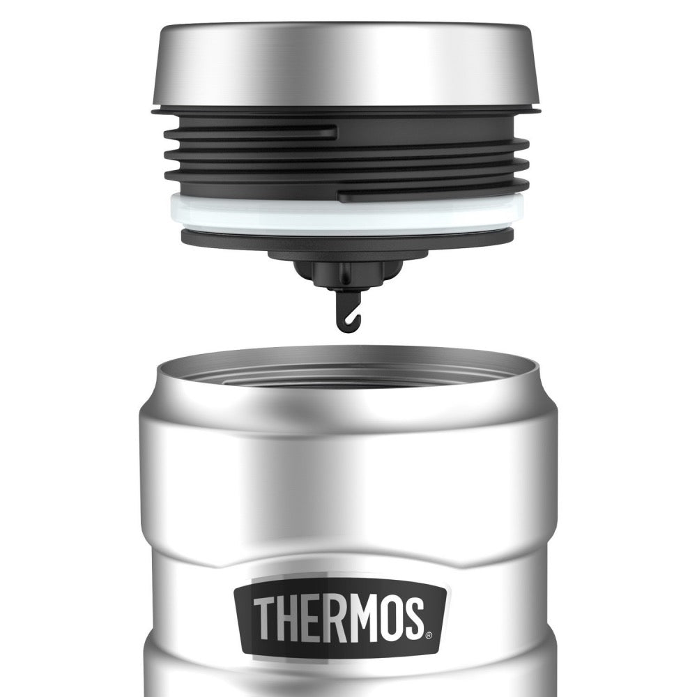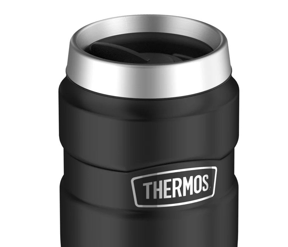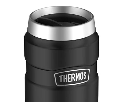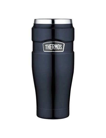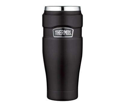 An ideal choice for on the go, the Thermos 16-Ounce Stainless Steel Travel Tumbler is built to last and loaded with features to make for a more enjoyable drinking experience. Thermos vacuum-insulation technology virtually eliminates temperature change within the beverage container by creating an airless space between 2 stainless steel walls. The result is a superior insulated container you can depend on to keep your beverages hotter, colder, fresher, longer. This travel tumbler keeps beverages hot for 5 hours or cold for 9, making it a great choice for long days out and about or in the office. Constructed with double wall stainless steel, this 16-ounce travel tumbler is durable, yet its sleek design is both eye-catching and functional. The contoured body shape is easy to grip and fits most automobile cup holders and is single serve compatible. For tea drinkers, a built-in tea hook is just the ticket to brew tea on the go. The tea hook can also accommodate most loose leaf infusers. The Stainless King Travel Tumbler comes equipped with a lid which operates simply by pushing the lever 45 degrees right or left to open and close. Because of the double wall insulation, the stainless steel body stays cool to the touch with hot beverages and condensation-free with cold beverages. In order to maximize the incredible insulation technology, it is recommended to either pre-chill or pre-heat the travel tumbler just prior to use. This can be accomplished by filling the tumbler with cold or hot tap water, attaching the lid and letting it rest for a few minutes. Before you are ready to use, simply empty the water and fill with your favorite beverage. The Stainless King Vacuum Insulated Travel Tumbler is made of BPA-free materials and is backed by a 5-year limited warranty.