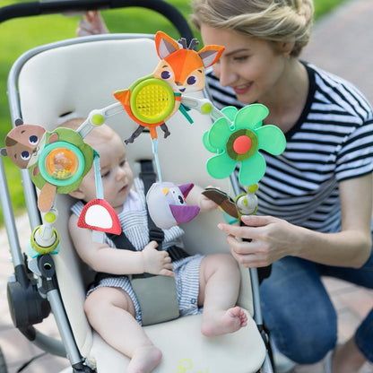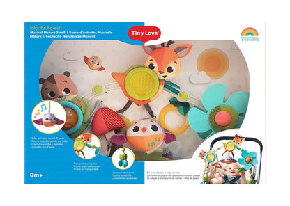 Unique stroller arch with musical electronic toy. Inspiration and engagement on the go! Includes 7 baby-activated toys offer plenty of fun on-the-go while putting development at babies fingertips and encouraging fine motor skills. Electronic bird toy plays 4 different tunes and can be activated by baby. This product is designed for two stages of development: sensory exploration (0m+) and cause & effect learning (5m+). Flexible arch easily adjusts to fit baby’s age and playing preferences. Part of the Into the Forest collection! Sharing those special Moments of Wonder with baby.
