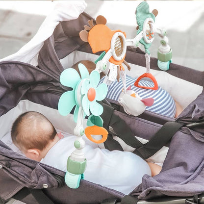 – Cognition – Your baby bats at the dangling toys, learning all about the wonders of cause and effect. Later, baby will learn to activate the electronic toy and pull the propeller to extend this understanding.