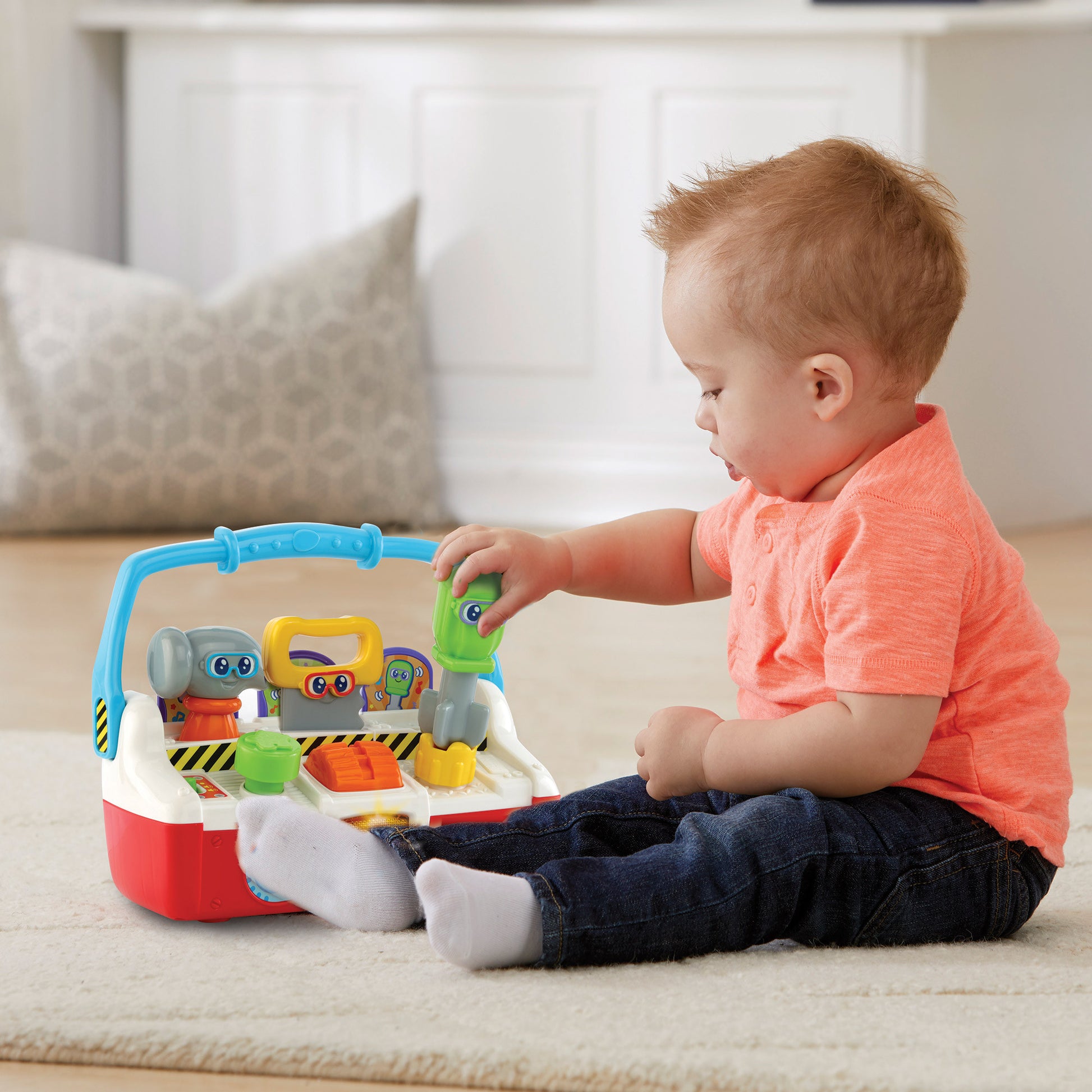 Meet the Tool Box Friends by VTech. This bright and colourful tool box is a great toy to support your little ones imaginative play. Perfect for children aged one to three years. Your little one will love using the manipulative features of the tool box. They can press, roll or turn the nail, screw or wood block to support and develop fine motor skills and hand eye coordination.