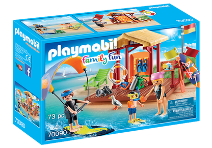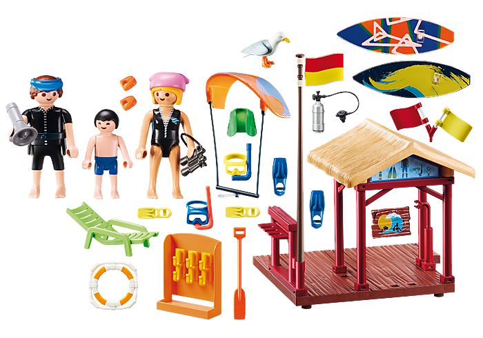Figures: 1 man, 1 woman, 1 boy Animals: 1 Gull Accessories: 1 water sports school, 1 shelf, 2 boards, 1 kite board with kite bar, 3 different flags, 1 diving bottle with regulator, 2 diving fins, 2 children's fins, 1 diving mask for adults, 1 children's diving mask, 1 diving jacket, 1 paddle, 1 deckchair, 1 life belt, 1 binoculars, 2 water wings, 1 headscarf, 1 peaked cap, 1 megaphone