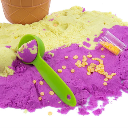 Contains: Pink & Green cotton sand 400g, 2 cones, Ice cream scoop, Fruits charms, Colored stick, Sprinkles, Umbrella.