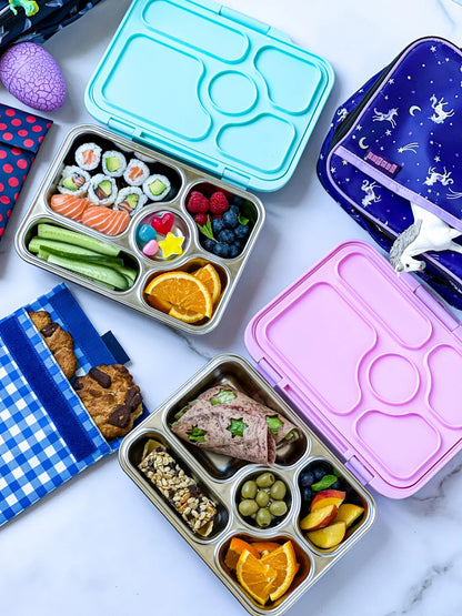 NEW! Yumbox Presto Leakproof 18/8 grade Stainless Steel Bento is designed for kids and adults. The 5 compartment stainless steel tray makes it easy to pack a nutritious lunch for work, school, sports and travel.