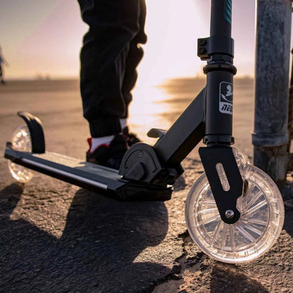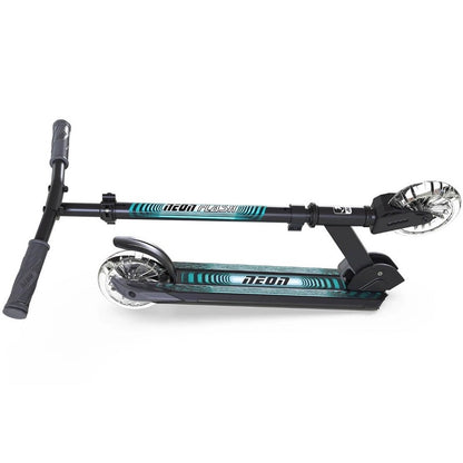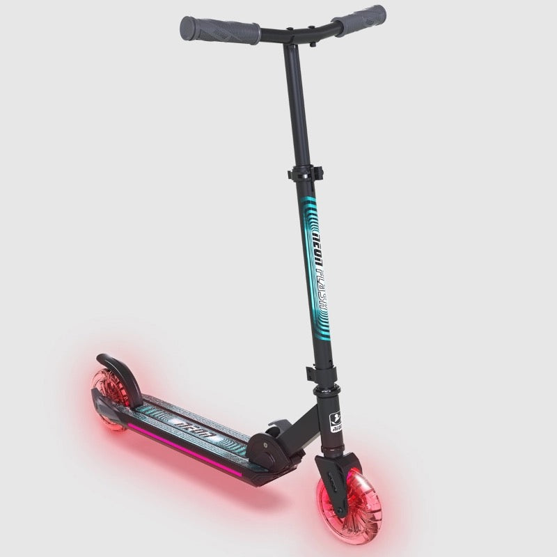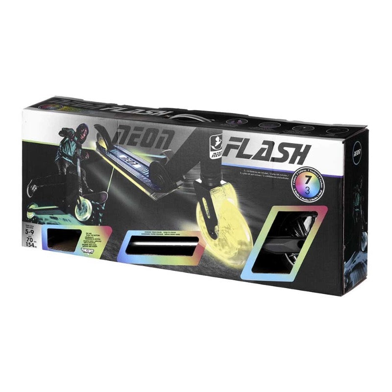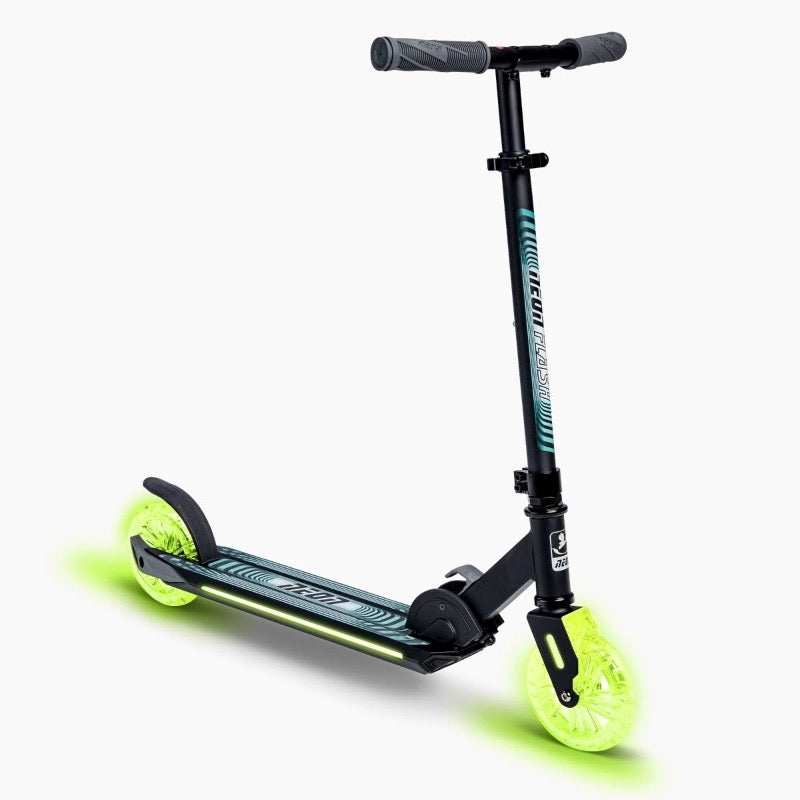 The NEON Flash is a new sturdy and durable scooter made of lightweight aluminum, combined with a unique light effect technology. It is a new bigger version of NEON Spectre. The dynamic lights effects on the front and rear wheels allow you to custom your ride with 7 colours and 3 modes. With lights on both sides of the deck for better visibility in low-light conditions, making this the perfect scooter all-year-round as a light-up commuter. Featuring an adjustable handlebar with 3 height settings and a large super grip deck, the NEW Neon Flash is ideal for everything from the school run to weekend fun. The lightweight frame and smooth-rolling wheels make this easy to ride, and there is even a rear foot brake for extra stopping power. The scooter also features an easy-folding frame by pulling the latch, making it ideal for carrying it around town or storing it at home.