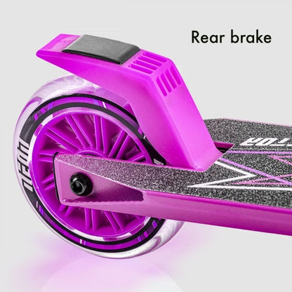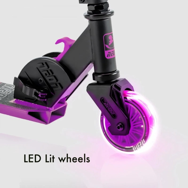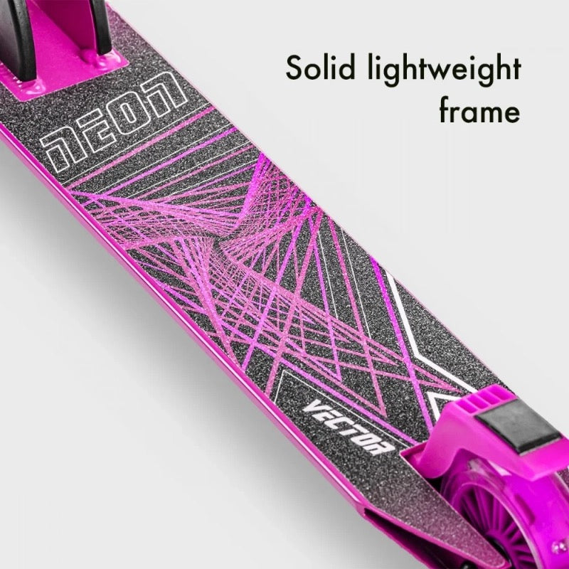 Sharp looks and the handling to match! Neon Vector is a sleek and lightweight scooter that will push your riding to the edge. Super-grip handlebars and rear brake make this one of our most versatile scooters for everyday use. The neon PU wheels light up the moment you kick off – when you’re done, simply fold the handlebars and to store it ready for the next day!