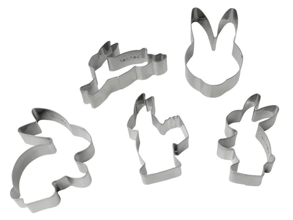 Cookie Cutter Set Easter Bunny 5Pcs., Accessories, Stainless Steel 18/0, Different Sizes, Ca. 93X58X26Mm, Dishwasher Safe, Designs: Standing Rabbit, Rabbit With Egg Cage, Hop Rabbit, Rabbit Head, Jumping Rabbit, Silver