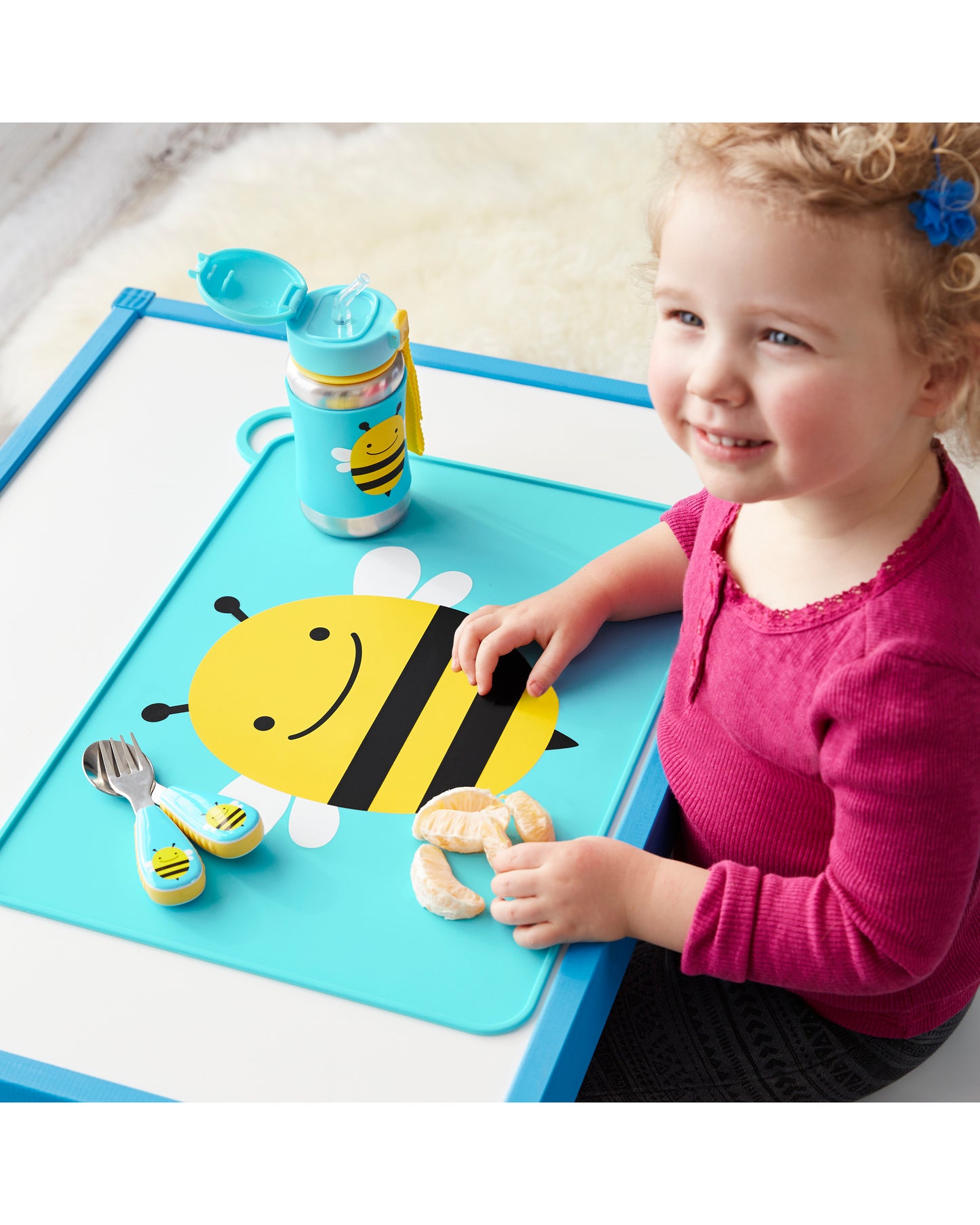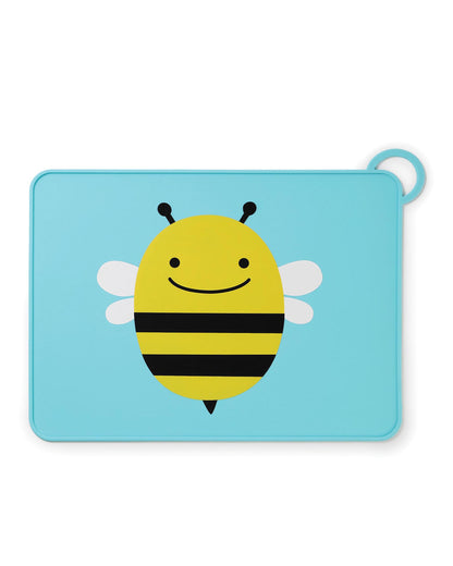 Our Zoo fold & go placemat for kids is the go-anywhere mealtime solution, with a non-slip surface and built-in loop closure. Just roll the mat up, fold it in half, then wrap the loop around so it won't unfold in your bag. Featuring our signature Zoo characters, it's made of food-grade, satin-touch silicone and has a raised edge to catch spills.